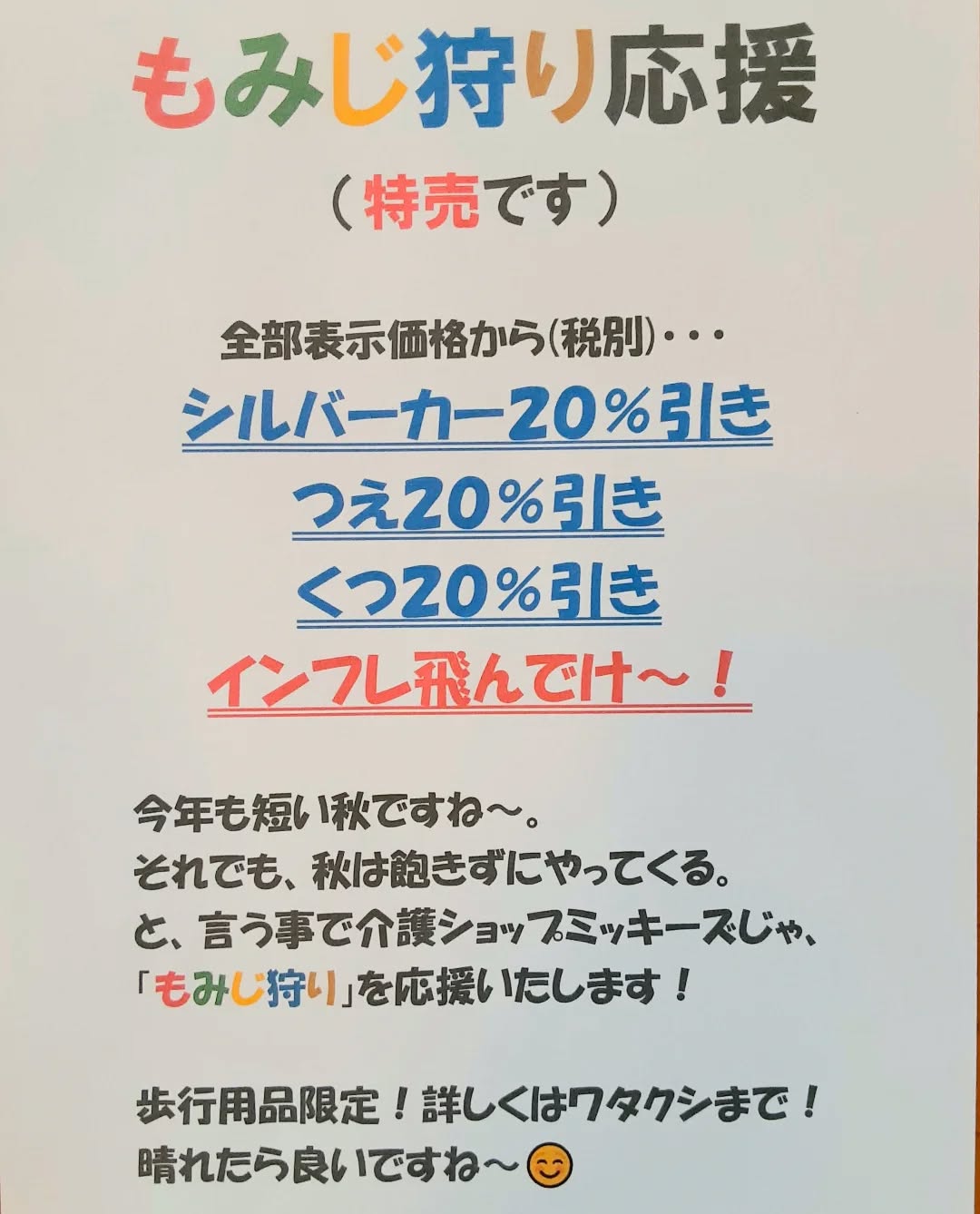 もみじ狩り応援! 2025 10/24 お知らせ 2025年10月24日 短い秋の到来!もみじ狩り応援と称して、歩行関係の品々を少しだけお求めやすくお買いいただけます。少し遠くまで行ってみませんか? お知らせ 関連記事 店休日のお知らせ 2025年10月3日 つえ先ゴムは定期的に交換を! 2025年9月21日 一品だけ、シルバーカーセール! 2025年9月15日 早仕舞いのお知らせ 2025年7月26日 各種キャッシュレスカード利用可能店 2025年5月31日 ステキなステッキ感謝祭! 2025年5月17日 GW感謝祭行います 2025年4月25日 お知らせ 2025年3月1日